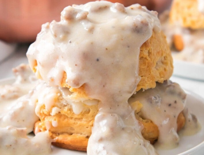 Dive into the ultimate Southern comfort food with two fluffy biscuits generously covered with our savory creamy gravy slow cooked and seasoned with love, including our signature potatoes and fluffy scrambled eggs