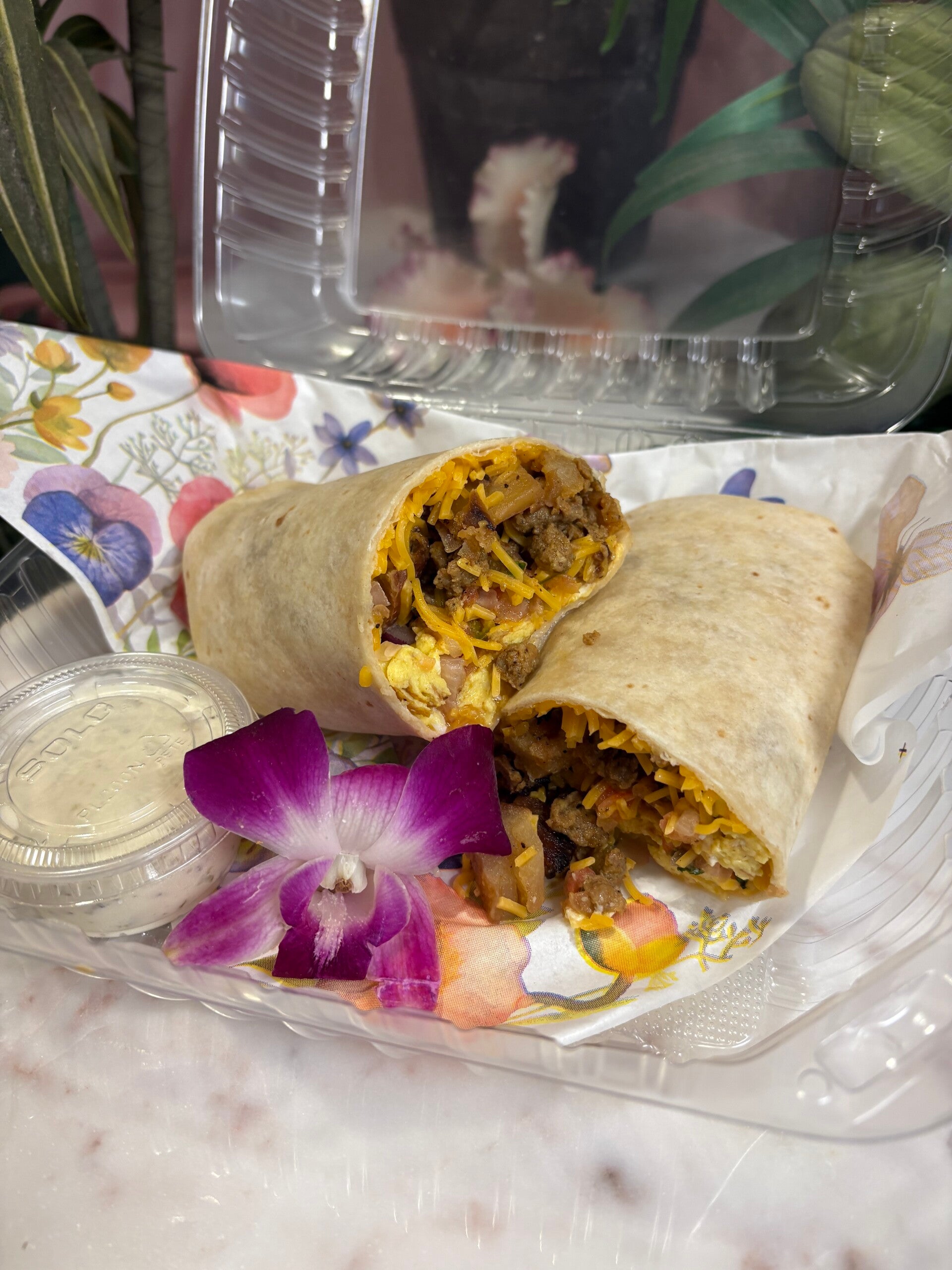 Try our spin on a traditional burrito with seasoned potatoes, cheddar cheese, fluffy scrambled eggs, chorizo, topped with home-made salsa, and fresh cilantro then snuggly wrapped in a flavored flour tortilla served with a side of jalapeño ranch