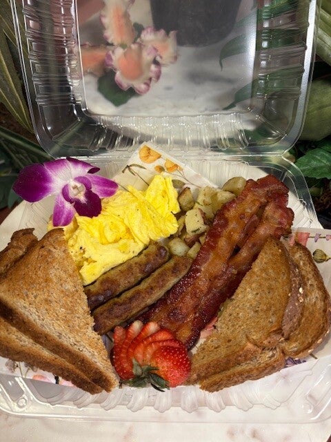 Like a variety? We’ve got you! Enjoy two fluffy scrambled eggs, two sausage links, two strips of bacon, a serving of home fries, multi grain toast, and fresh fruit garnish