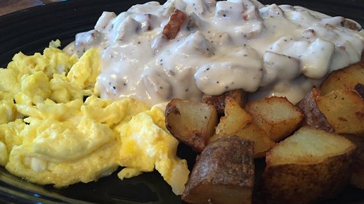 SOUTHERN STYLE BISCUITS & GRAVY COMBO - Dive into the ultimate Southern comfort food with two fluffy biscuits generously covered with our savory creamy gravy slow cooked and seasoned with love served with our signature potatoes and fluffy scrambled eggs